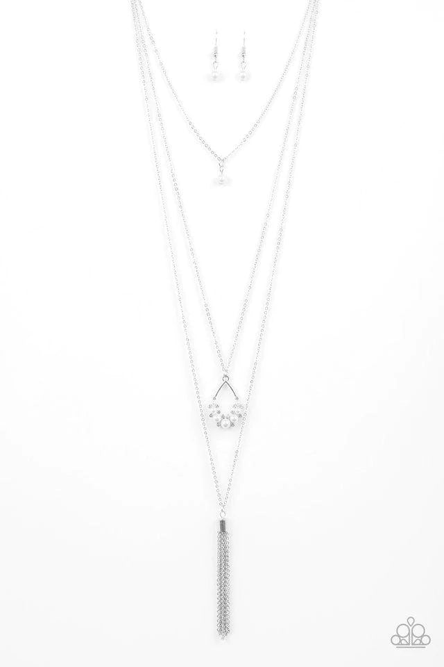 A solitaire white pearl swings from the uppermost chain, giving way to a teardrop pendant and shimmery silver chain tassel. Dainty white rhinestones and white pearls collect at the bottom of the centermost pendant for a glamorous finish. Features an adjustable clasp closure.