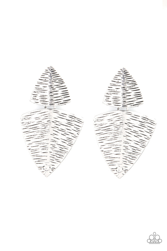 Etched in antiqued linear details, a pair of beveled silver frames delicately link into a handcrafted lure for a bold tribal flair. Earring attaches to a standard post earring.